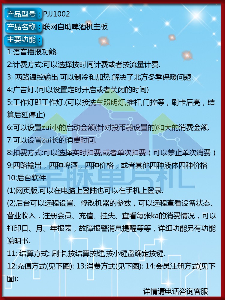 广州宇脉电子MCU单片机开发厂家,自主研发自助啤酒售卖机主板,支持联网支付功能:微信、支付宝、扫码支付功能刷卡,注册会员可以直接输入手机号加密码,更加方便用户,不用带卡就能启动设备消费,减少成本。主控板多功能,可以远程查看设备状态,明细报表等功能。欢迎来电了解   18520500709/400-1898-020