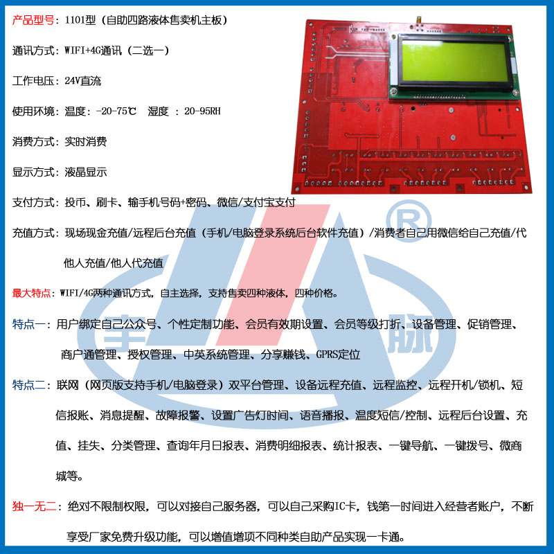 宇脉电子主板生产厂家,自主研发新品上市——自主四路液体售卖机主板,主板性能稳定,支持售卖四种液体,四种价格,自主设置参数,主板通讯方式WIFI+4G两种自主选择。主控技术自主研发,支持定制功能。